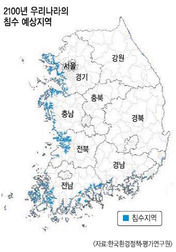 기후변화에 따른 해수면 상승으로 2100년에 우리나라 국토의 4.1%가 침수된다는 전망이 나왔다. 침수구역 주거지는 전국 주거지의 5%에 이르고 침수된 주택의 가치는 30조원에 이를 것으로 보인다.