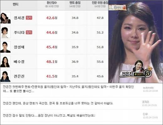 다만 제 3자인 전문심사위원단들은 전은진에게 45.6점의 최저점을 주었다는 점에서 눈길을 끈다. 이는 곧 전은진의 심사에 멘토들의 애정어린 사심이 반영되었다는 방증이기 때문이다. 멘티에 대한 애정으로 독설은 아끼고 점수는 퍼주는 '후한 평가' 논란의 연장선이다.