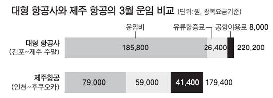 같은 제주항공으로 김포~제주를 오갈 경우에도 정상 운임료(부대비용 포함)는 16만6,400원이다. 결국 제주항공을 타도 1만원 정도만 더 내면 일본을 갈 수 있다는 얘기다.