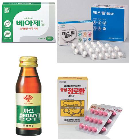 우리가 흔히 알고 있는 소화제 중 동아제약 베스타제, 대웅제약 베아제, 한독약품 훼스탈 등은 소화효소로 만든 제품이고 동아제약 맥소롱, 보령제약 겔포스 등은 제산제가 주성분인 제품이다. 동화제약 까스활명수나 동성제약 정로환 등은 주성분이 생약성분으로 살균·진정·진경작용으로 위산을 억제하고 소화력을 높여준다.
