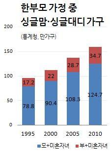 통계청이 실시한 2010년 인구 총조사에 따르면 아빠나 엄마 중 한명과 미혼 자녀로 구성된 가구는 159만 가구로 10년 전에 비해 47만 가구 늘었다. 싱글맘 비중이 78%로 싱글대디에 비해 절대적으로 많다.