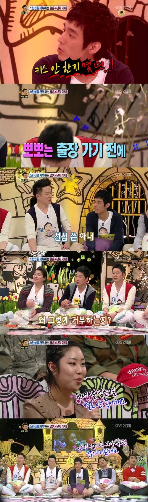 한편 이에 MC 들이 객석에 앉아 있던 아내에게 스킨십 거부 이유를 묻자, 아내는 "원래 살 닿는 걸 별로 안 좋아한다. 아기가 생기고 나서부터는 몸이 피곤하다.", "남편이 결혼 전에는 잘 생겼었다. 좀 더 자신을 가꿨으면 좋겠다."는 솔직한 속내를 털어놨다.