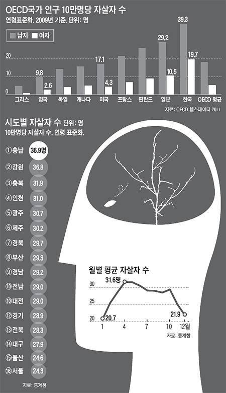 한국이 자살 수렁에 빠져 있다. 독일 · 덴마크 · 오스트리아 등 OECD 대다수 국가는 1995년부터 2009년까지 15년간 자살률이 30% 이상 크게 떨어졌다. 그러나 한국은 오히려 같은 기간 자살률이 153%나 늘었다. 왜 한국만 자살률이 크게 늘고 있는 것일까.