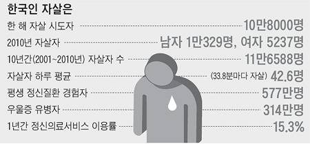 보건복지부 의 '2011년 정신질환 실태 조사'를 보면 자살을 고민한 적이 있는 사람은 100명 중 16명이고, 실제 자살을 기도한 것은 100명 중 3명이었다. 한해 10만8000명의 한국인이 자살을 기도하는 셈이다.