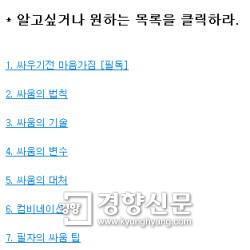 카페 운영진들은 모여든 이들과 싸움 경험담, 격투기 영상 등을 공유했다. 이 중 많이 알려진 것은 ㄱ씨의 경험담을 기초로 만들어진 일종의 '이론서'다. 싸우기전 마음가짐부터 싸움의 법칙·기술·변수·대처법 등으로 분류돼 있는 자료다. '싸우기전 마음가짐'에는 "한대 맞더라도 쫄지말고, 오히려 맞은 것에 대해 분노하라"며 "다만 이성을 잃을 만큼 흥분하면 안된다. 흥분을 하면 아드레날린이 형성되는데, 심성이 착한 사람의 경우 긴장이 극에 달해 근육의 긴장 수축으로 이어진다"고 써 있었다.