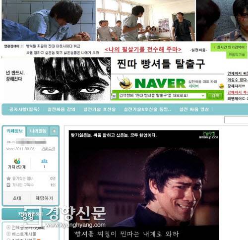 지난해 8월 한 인터넷 포털에는 이같은 글과 함께 '찐따빵셔틀탈출구'란 카페가 만들어졌다. 학교폭력 피해 경험을 지녔다는 ㄱ씨가 만든 이 모임은 말그대로 '찐따'(덜떨어진 아이)라 놀림을 당하거나, '빵셔틀'(힘센 학생들의 강요로 빵을 대신 사다주는 행위) 피해를 입는 학생들을 위한 '멘토'를 자처했다. 당시 카페의 홍보글에는 "여러분과 같은 경험자로서 저의 경험담을 토대로 필살 싸움 교본을 만들었다"며 "싸움을 못하시는 분들이나 싸움을 배우려는 분들께 많은 도움이 될 것"이라고 적혀 있었다.