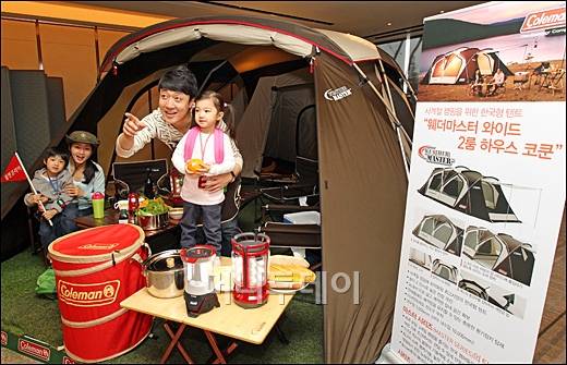 아웃도어 캠핑 브랜드 콜맨(대표 리차드 엘 길포일)이 28일 오전 서울 소공동 한 호텔에서 변화무쌍한 한국 사계절 기후와 소비자 아웃도어 라이프 스타일에 최적화된 한국형 텐트 '웨더마스터 와이드 2룸 코쿤'을 선보이고 있다.