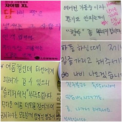 하지만 이번에 공개된 도서관 쪽지 유형을 보면 반전이다. 쪽지에는 "하품하실 때 제발 입 좀 가리고 합시다. 나비 나오겠어요", "친구분과 속삭이지 말고 나가서 말씀하세요", "에어콘 가동이라 환기도 안 되는데 향수 뿌리지 맙시다"라는 등의 글들이 적혀있다.