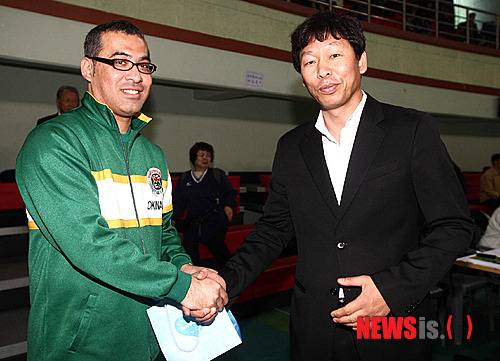 【충주=뉴시스】조종원 기자 = 14일 충북 충주 호암체육관에서 열린 35회 국무총리배 전국남여9인제 배구대회 한-일 남자 국제친선경기에 앞서 한국광양자원 김형용 감독과 일본덕주병원 신조 투요시 감독이 인사를 나누고 있다. (사진=스포츠포커스 제공)