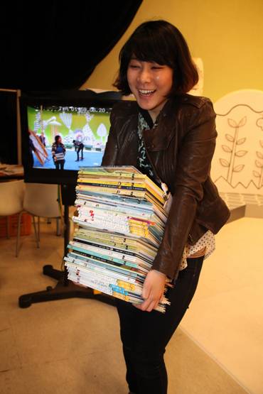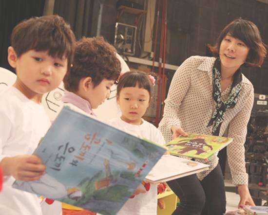 박유림 PD가 아이들과 함께 바닥에 널려있는 책을 한권 한권 옆 친구에게 전달해서 책꽂이에 정리하는 촬영리허설을 하고 있다. 이치열 기자 truth710@ |