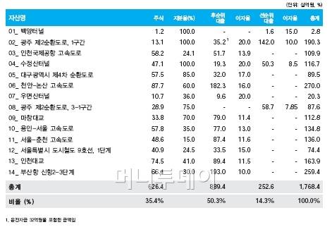 맥쿼리인프라가 투자한 다른 민자유치 사업도 지분과 후순위대출을 결합한 형태로 이뤄져 있다. 1903억원을 투입한 광주 제2순환도로의 경우 지분 투자 131억원에 후순위대출 352억원은 연 20%, 1420억원의 선순위 대출은 연10%의 금리를 각각 적용하고 있다. 1167억원이 투자된 수정산터널 사업도 1923억원 규모의 후순위채에 대해 20%의 금리를 적용하고 있다.