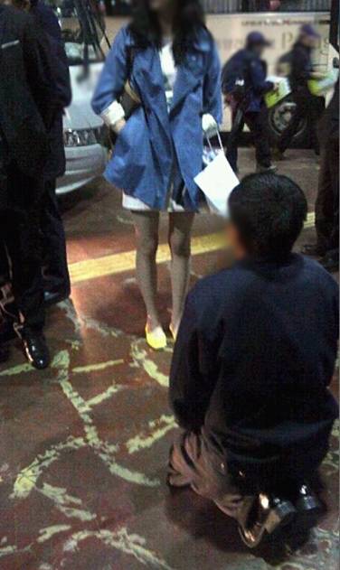 사진 속에는 버스기사로 보이는 한 중년 남성이 길바닥에 무릎을 꿇고 있으며 그 앞에는 젊어보이는 여성이 주머니에 손을 넣은 채 다른 곳을 쳐다보고 있다.