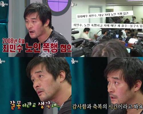 최민수는 18일 오후 방송된 MBC '황금어장-라디오스타'에 출연, "2008년 노인 폭행 사건이 결국 무혐의로 판명됐지만, 노인과 연루된 사건이었기에 어쨌든 내 잘못이라고 생각한다"고 말했다.
