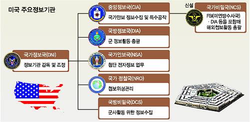 [세계일보]미국은 세계에서 가장 막강하고 방대한 정보조직을 자랑하는 나라다. 국가정보국(DNI), 중앙정보국(CIA), 국방정보국(DIA), 국가안보국(NSA)…. 인공위성과 무인정찰기 드론, 컴퓨터 등 첨단 장비를 동원해 세계 곳곳의 정보를 샅샅이 뒤지고 있다. '미국의 눈을 피할 수 있는 곳은 없다'는 말이 나올 정도다.