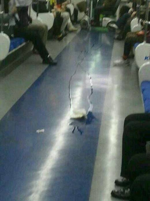 사진에는 지하철 칸 한가운데에 놓인 배설물을 덮은 휴지와 함께 소변으로 보이는 액체가 지하철의 움직임에 따라 칸 끝까지 흘러간 모습이 담겨 있다.