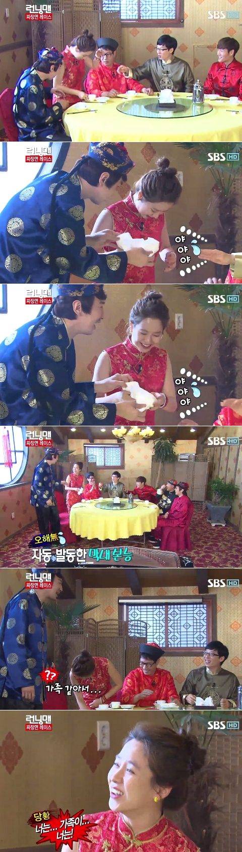 출연진들을 만나기 전, 멤버들은 중국 전통의상을 입고 둥글게 둘러 앉아 이야기를 나눴다. 이때 지석진이 이야기를 하다가 송지효의 컵을 건드려 물을 쏟았다.