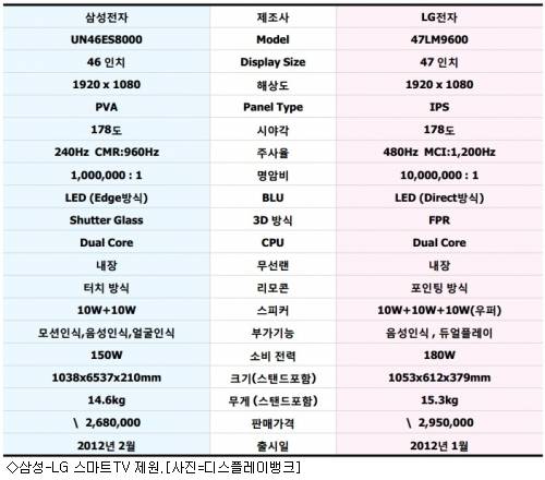 디스플레이뱅크는 지난 8일 '2012년 신제품 TV 비교'라는 보고서를 통해 국내 대표적인 두 TV 제조사의 최신 스마트TV를 평가했다. 대상 모델은 삼성 'UN46ES8000F'와 LG '47LM9600'. 두 제품 모두 양사의 2012년형 신제품 중 최고 라인업이다.