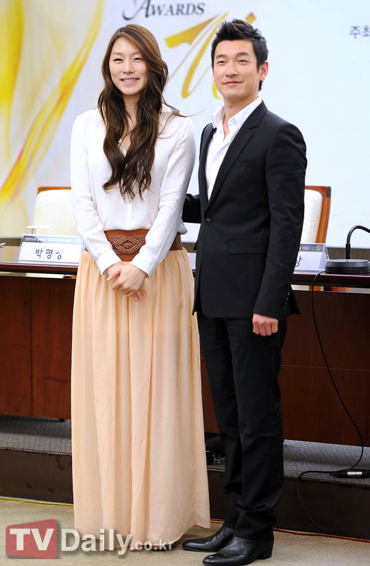 이날 제6회 '더 뮤지컬 어워즈' 기자간담회에 참석한 홍보대사 차지연과 조승우가 포즈를 취하고 있다.