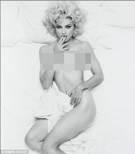 흑백사진 속 짧고 곱쓸거리는 금발의 마돈나는 널찍한 흰색 시트의 침대에 누워 가슴을 그대로 드러내고 오른손으로 입에 담배를 갖다대며 도발적인 시선으로 정면을 바라보고 있다.