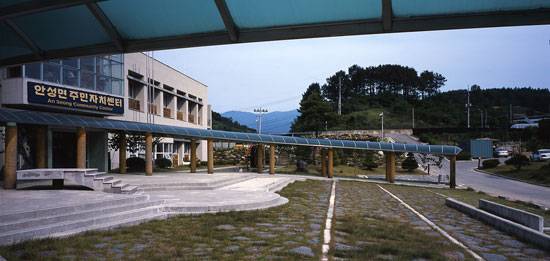 권위적이며 군림하는 면사무소가 아니라, 주민들이 제집처럼 편안히 머무는 면민의 집을 생각하며 개축한 안성면 주민자치센터. 넉넉한 덕유산과 너른 들판이 있는 자연에 사람이 조화롭게 포개어 살기를 바라며 지은 자연친화적인 건물이다.