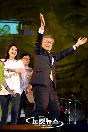 노무현 전 대통령 서거 3주기를 나흘 앞둔 19일 오후 서울시청 앞 광장에서 열린 추모문화제에서 문재인 민주통합당 당선자가 영화 '써니'의 ost인 Boney M의 'Sunny'곡에 맞춰 춤을 추고 있다.cybercoc1@cbs.co.kr