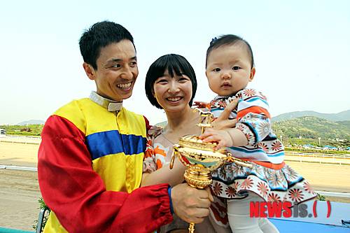 '지금이순간'은 20일 과천 서울경마공원에서 열린 제15회 코리안더비(국산 3세, 1800M, GI)에서 폭발적인 막판 뒷심으로 1위로 결승선을 통과했다. 2위는 0.2초 뒤진 부산경남경마공원의 '노벨폭풍'이 차지했다. 사진은 코리안더비 우승 후 문세영 기수 김려진 아나운서 딸 도윤이 트로피를 들고 기뻐하고 있다. (사진=한국마사회 제공)