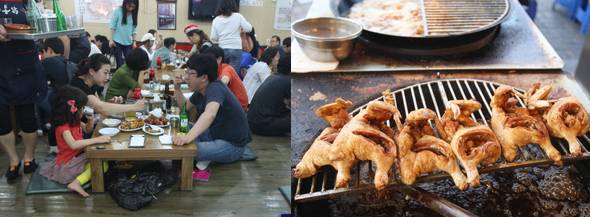 가게 안도 진풍경이다. 해가 떨어지기 전에 폭탄주를 제조하는 20대, 등산을 하고 내려와 허기진 배를 허겁지겁 채우는 40대, 조막만한 아이 손에 잘게 찢은 닭고기를 얹어주는 30대 등. 앞집 용성통닭도 바쁘기는 마찬가지다. 13년 전부터 용성통닭을 운영한 주인 한창석(58)씨는 한때 "후배 빚보증을 잘못 서는 바람"에 오갈 데가 없을 정도로 나락에 떨어졌었다.
