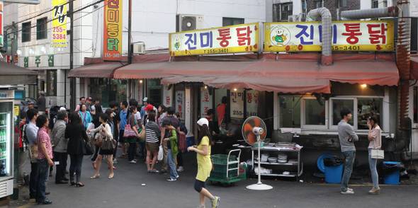 통닭집 앞은 진풍경이다. 휴대폰을 꺼내 사진을 찍는 통닭 여행객이 있는가 하면, 배를 두둑하게 채우고 의기양양 아이스크림 베어 문 이도 있다. 가게 밖 가마솥에는 닭을 튀기는 종업원들의 손이 바쁘다. 밀가루와 갖은 양념을 버무린 튀김옷에 닭을 던지고 꺼내 튀기고 묻히고 튀긴다.