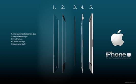 데 로사가 디자인한 '아이폰 플러스'는 리퀴드 메탈로 만들어 졌으며 이중의 알칼리 알루미노 규산염 시트가 스크린에 적용된다. 화면 크기는 4.3인치이다.