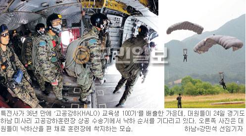 우리나라 고공교육의 모체이자 전군 유일의 고공전문 부대인 특전사가 36년 만에 '고공강하(HALO)' 교육 100기생을 배출한다. 고공강하는 3000m 이상의 상공에서 항공기를 이탈, 자유 낙하한 다음 1000m의 고도에서 낙하산을 펼쳐 목표지점으로 정확히 착지하는 고난도 전투기술이다.