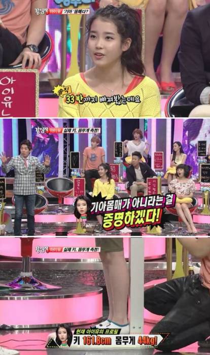아이유는 29일 밤 방송된 SBS TV '강심장'에 출연, 스튜디오에서 실제 키와 몸무게를 재보이며 몸매 논란을 불식했다.