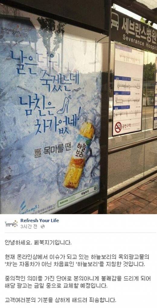 5일 트위터 등 SNS에는 한 네티즌이 직접 촬영한 것으로 보이는 '하늘보리' 광고가 올라왔다. 서울 신촌 세브란스병원 버스 정류장에 붙은 이 광고는 '날은 더워 죽겠는데 남자친구는 차가 없네'라는 카피를 포함하고 있다.