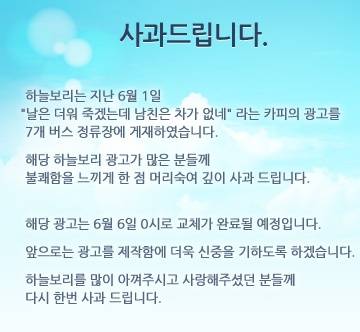 또 홈페이지를 통해서도 '사과드립니다'는 사과문으로 "하늘보리는 지난 6월 1일 '날은 더워 죽겠는데 남친은 차가 없네'라는 카피의 광고를 7개 버스 정류장에 게재했습니다. 해당 하늘보리 광고가 많은 분들께 불쾌감을 느끼게 한 점 머리숙여 깊이 사과드립니다"며 "해당 광고는 6월 6일 0시로 교체가 완료될 예정입니다. 앞으로는 광고를 제작함에 더욱 신중을 기하도록 하겠습니다"고 사과했다.