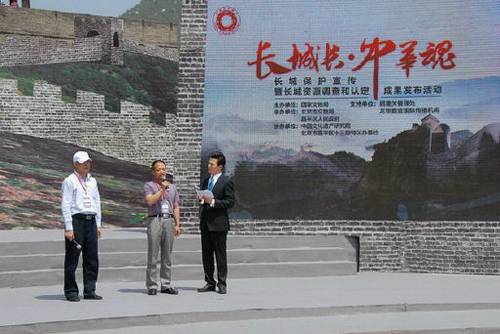 축하연도 열어 중국의 역대 장성 길이 선포식 현장에서 '장성자원조사'팀 관계자가 활동성과 보고를 하고 있다. 뒤편 대형 스크린의 '長城長 中華魂(장성 확대는 중화혼)'이라는 구호가 눈길을 끈다.자료:중국 국가문물국 |