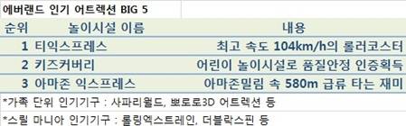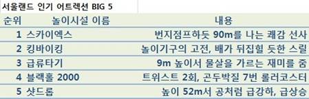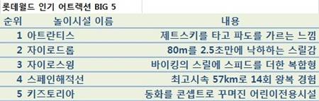 롯데월드 관계자는 "연령층에 따라 조금씩 다른 데 그중 빅5를 꼽아보면 `아트란티스` `자이로드롭` `자이로스윙` `스페인해적선` `키즈토리아`"라며 "기본적인 운동원리로 찰나의 극한 스릴에 특수효과까지 살린 탑승물이 인기"라고 설명했다.
