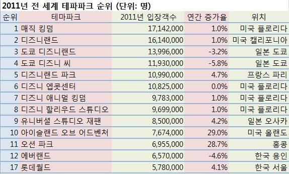 세계엔터테인먼트협회(TEA)가 최근 발표한 2011년 `놀이공원(테마파크)` 순위(입장객수 기준)에 따르면 전 세계 1위 테마파크는 미국 디즈니월드가 플로리다에서 운영하는 `매직 킹덤`이 차지했다. 작년 한 해 동안 총 1714만2000명이 다녀갔다.