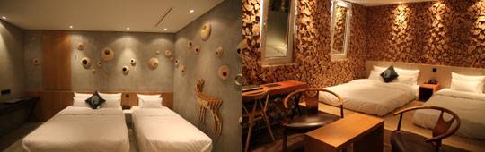 모든 객실은 저마다의 콘셉트와 디자인에 따라 비틀즈, 더 파빌리온, 스윗버블트리 등의 재미있는 룸네임이 있다. 비틀즈 룸은 벽돌을 쌓은 듯한 벽면과 노출 시멘트로 마감한 천장에 적힌 메시지가 시선을 끈다. 거기에 유니언 기를 모티브로 프린팅 된 소파와 장식장, 함께 놓인 확성기가 조화를 이뤄 금방이라도 비틀즈가 나올듯한 연출로 이색적이다. 더 파빌리온 룸은 사각정자를 배치해 한국 전통의 고풍스러움을 연출했다. 그 외 오가닉 콘셉트의 룸은 느티나무로 숲 속 느낌을 살리고 여배우의 대기실을 모티프로 한 룸은 물방울 등을 사용해 화려함을 더하는 등 90개의 객실마다 놀라움과 재미를 자아내는 요소들로 가득하다.