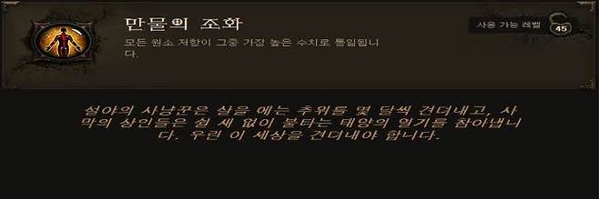 또 다른 패시브인 만물의 조화 역시 매우 유용한 패시브이다. 불, 냉기, 독 등 다양한 속성 공격을 하는 몬스터들의 공격을 막아내려면 해당 속성의 저항력을 높여주어야 하는데 만물의 조화는 이 속성 저항 수치를 가장 높은 수치로 통일해준다.