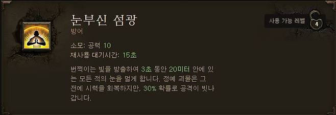 또 다른 기술인 눈부신 섬광 역시 좋은 성능의 회피 기술이다. 주변의 적들에게 실명효과를 주는 눈부신 섬광은 몬스터들에게 둘러 싸여있는 상황에서 효과적이며, 위기 상황을 탈출할 수 있는 기술이다. 비록 정예 몬스터에게는 실명이 되지 않고 30%확률로 공격을 피할 수 있게 된다.