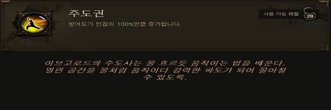 수도사를 플레이하는 게이머 10명 중 9명은 사용하고 있는 패시브는 방어도가 민첩의 100%만큼 증가하게 되는 주도권 이다. 근접 공격 캐릭터인 수도사는 민첩이 높을수록 회피율과 공격력이 증가하기 때문에 민첩이 매우 중요한데 민첩1=방어도1=공격력1 만큼 수치가 오르게 되는 주도권은 회피, 방어력, 공격력을 동시에 상승시켜 주어 매우 효과적인 기술이다.
