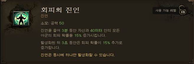 어느 정도 저항 수치가 만족된다면 회피의 진언도 좋은 선택이 된다. 회피의 진언은 3분동안 회피율을 15% 올려주며, 힘든 상태 룬을 선택하면 방어도를 20% 상승시켜준다. 만약 2초동안 회피율을 16% 상승시켜주는 천둥주먹, 전광석화 룬을 함께 사용한다면 맞지도 않고, 맞아도 아프지 않은 진정한 탱커로 거듭날 수 있다.