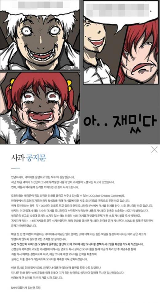 이는 앞서 '귤라임'이라는 닉네임을 쓰는 만화가 지망생이 네이버 웹툰 코너에 올린 초등학생을 성폭행하는 장면이 담긴 만화가 방치된 것에 대한 사과문이다.