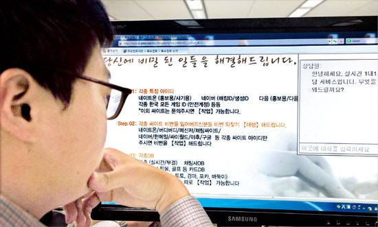 IT 흥신소는 이 밖에도 특정 인터넷 홈페이지를 해킹해 고객 정보를 빼온다. 홈페이지 보안 정도에 따라 가격은 다르게 매겨지지만 보통 해킹은 500만원, 디도스 공격은 하루에 200만원 내외로 책정돼 있다. 인터넷 포털에서 해킹한 주민번호 등 개인정보도 건당 1500원가량에 거래한다. 의뢰인이 이름과 주민번호, 아이디만 알고 있으면 특정인이 사용하는 주요 인터넷 포털의 비밀번호를 알려주는 일도 한다.