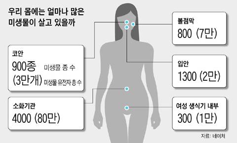 우리 몸에 사는 미생물의 총 유전자 수는 약 800만개로 밝혀졌다. 인간 유전자 2만2000개의 360배나 되는 양이다. 해독한 유전자 염기만 3조5000억개로 2000년 인간게놈프로젝트에서 나온 사람 유전자 염기 해독량의 1000배나 됐다.