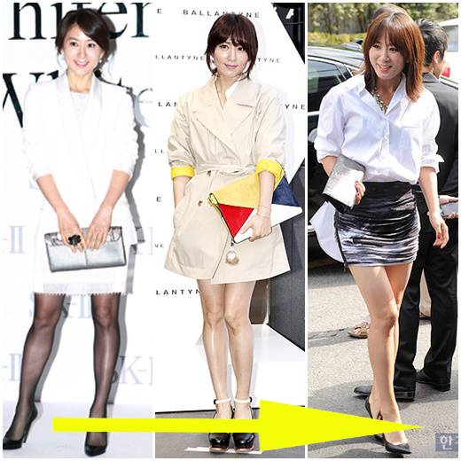 김희애의 동안 스타일의 비법은 스커트 길이. 올해 다양한 행사장에 모습을 드러낸 김희애의 스타일을 살펴보면 롱스커트에서 짧은 미니스커트까지 스커트 길이가 점점 짧아지고 있다. 지나가는 세월에 반비례해 짧아지는 스커트가 그녀의 동안 스타일링 법인 셈이다.