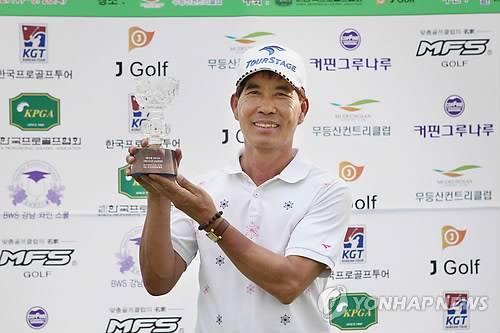 (서울=연합뉴스) 28일 전남 화순 무등산골프장에서 열린 제13회 한국프로골프협회(KPGA) 그랜드 시니어선수권대회에서 우승한 문춘복(60.투어스테이지)이 트로피를 들어보이고 있다. 2012.6.28 < < KPGA > >