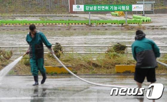 중부지방에 내린 폭우로 강남 탄천이 범람한 6일 오후 서울 강남 탄천주차장과 강남운전면허 기능시험장 일부가 침수되어 인부들이 복구 작업을 하고 있다. 강남운전면허시험장은 오전 한때 기능시험이 전면 취소되었다. 2012.7.6/뉴스1