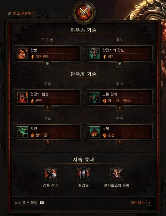 극딜 야만용사 스킬 조합 중 최소한의 방어를 책임지는 기술은 방어도가 20% 증가하는 '전장의 함성', 5초 동안 받는 피해가 모두 감소하는 '고통 감내' 등이 주로 사용된다.