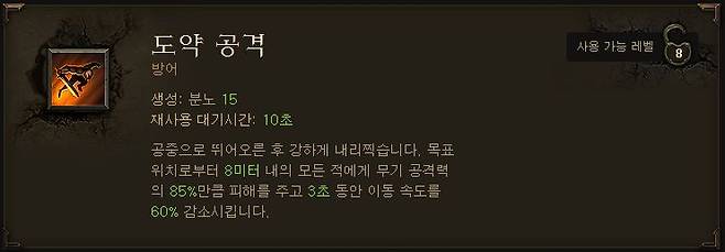 다르게 사용되는 기술로는 야만용사의 기술 중 유일하게 생존기로 불리는 '도약공격'이 있다. 공중으로 뛰어올라 공격하는 '도약공격'은 적들과의 거리를 좁히기 위해 추가된 기술이지만 불지옥 난이도의 야만용사에게는 적에게서 도망가는 생존기로 사용된다.
