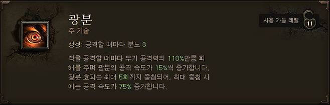 다만 체력을 회복하는 기술이 부족하여 물약이 다수 사용되긴 하지만 일반, 악몽 등 초반 난이도의 야만용사 플레이는 타 직업의 캐릭터와 비교를 할 수 없을 정도로 호쾌한 느낌을 받을 수 있다.